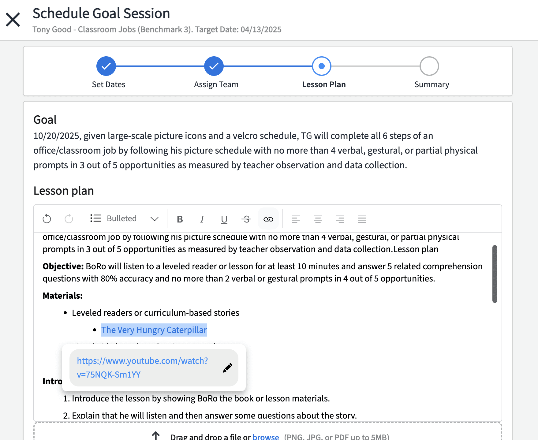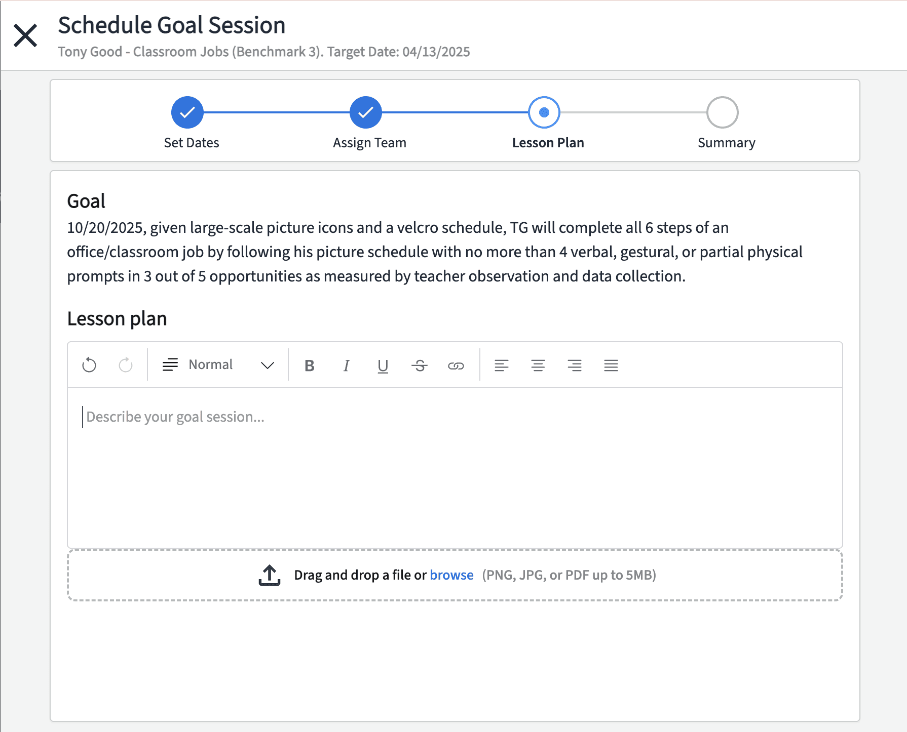The Attaching Lesson Plans feature enhances the recurring goal session by providing a centralized space for instructions, resources, and detailed lesson plans. This ensures team members are well-prepared to execute goals effectively.